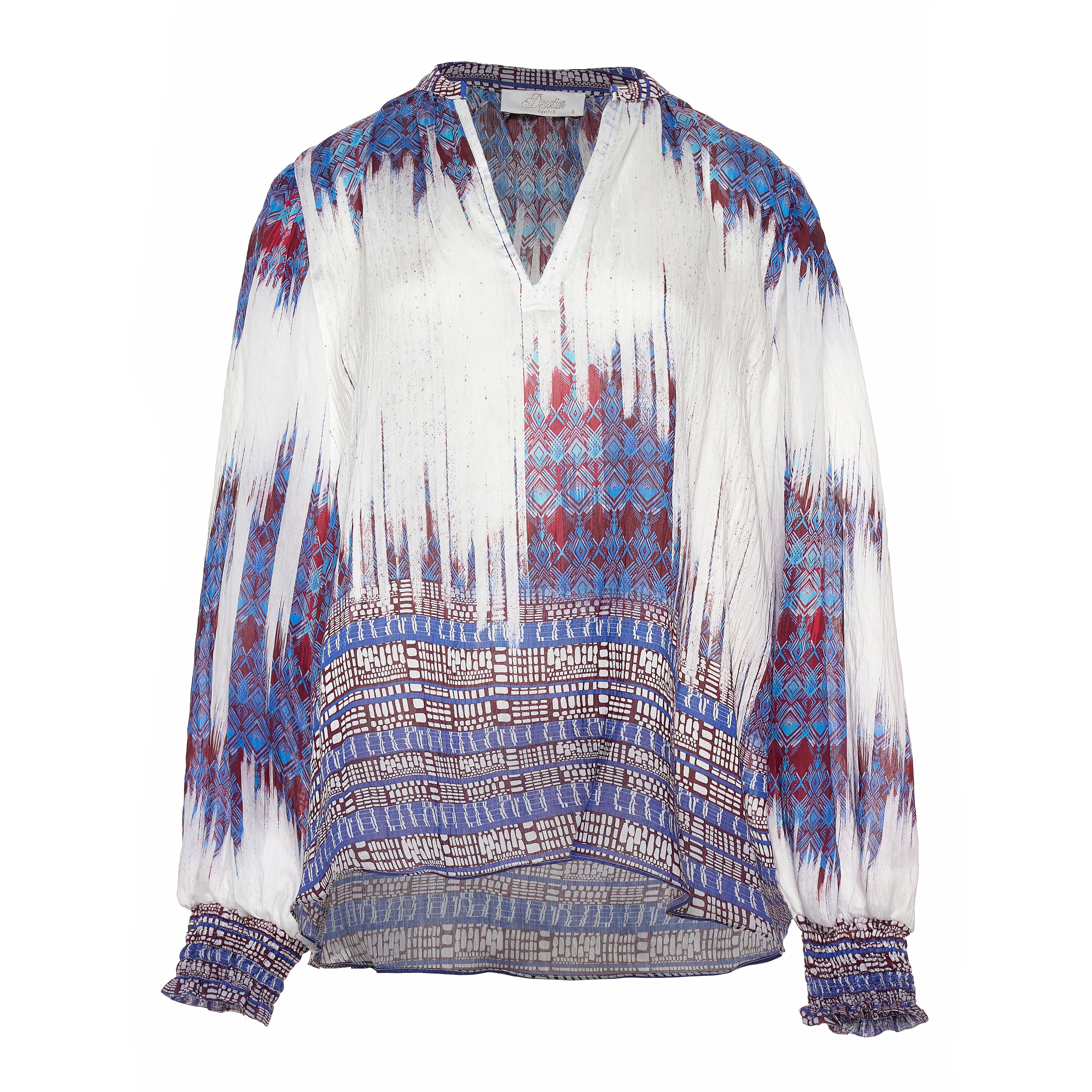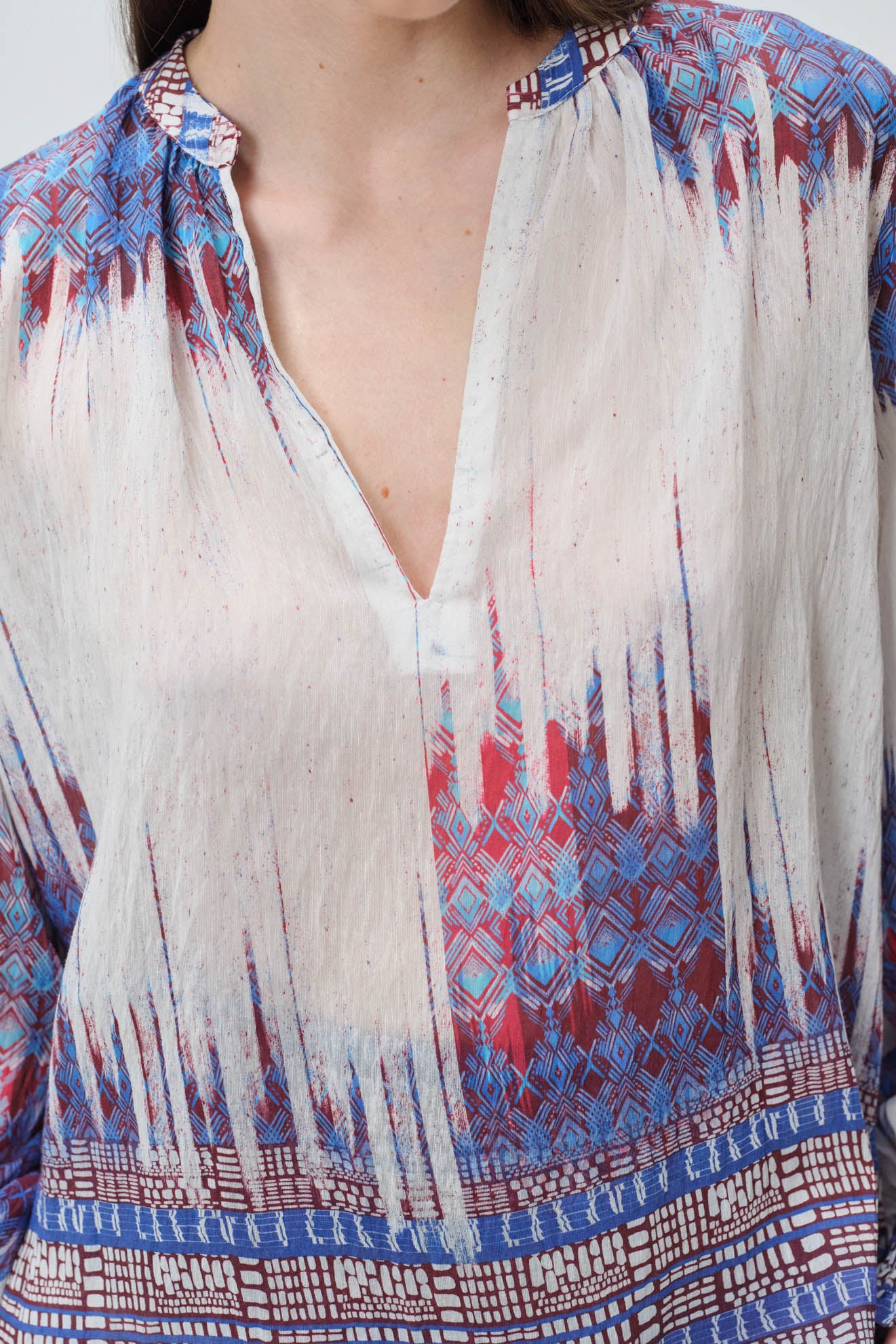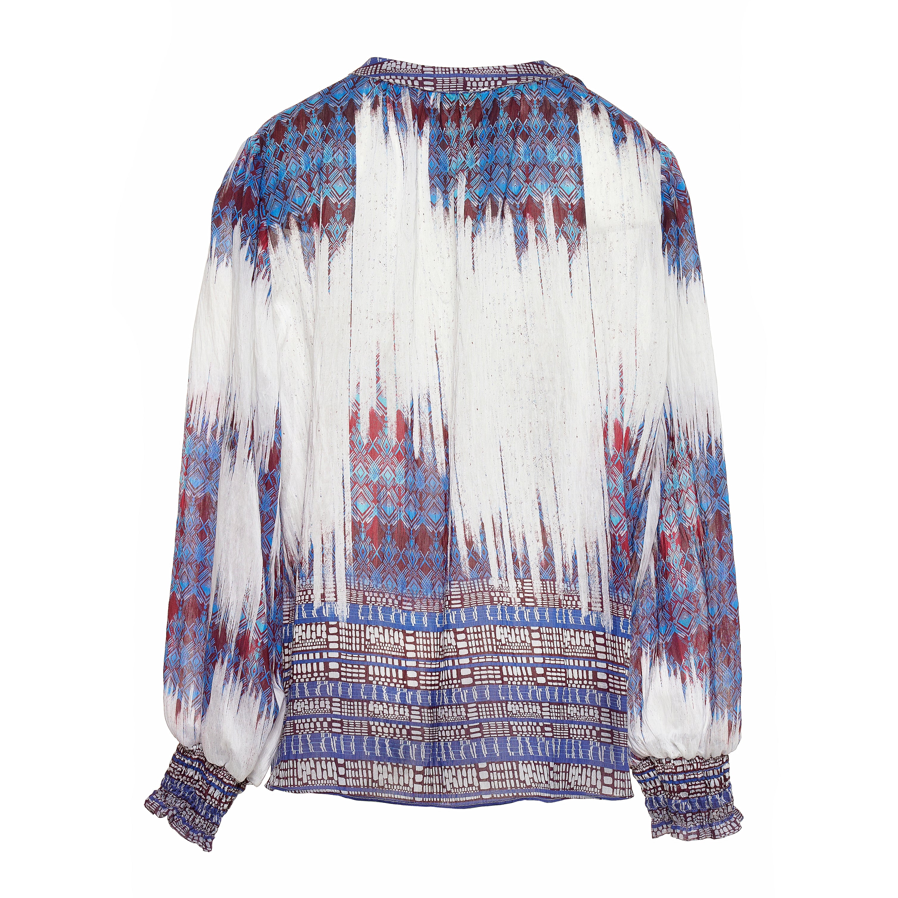 All-over abstract tie-dye and bohemian border print in white base with indigo, burgundy and earthy accents