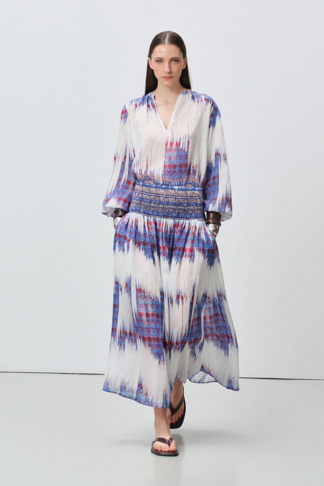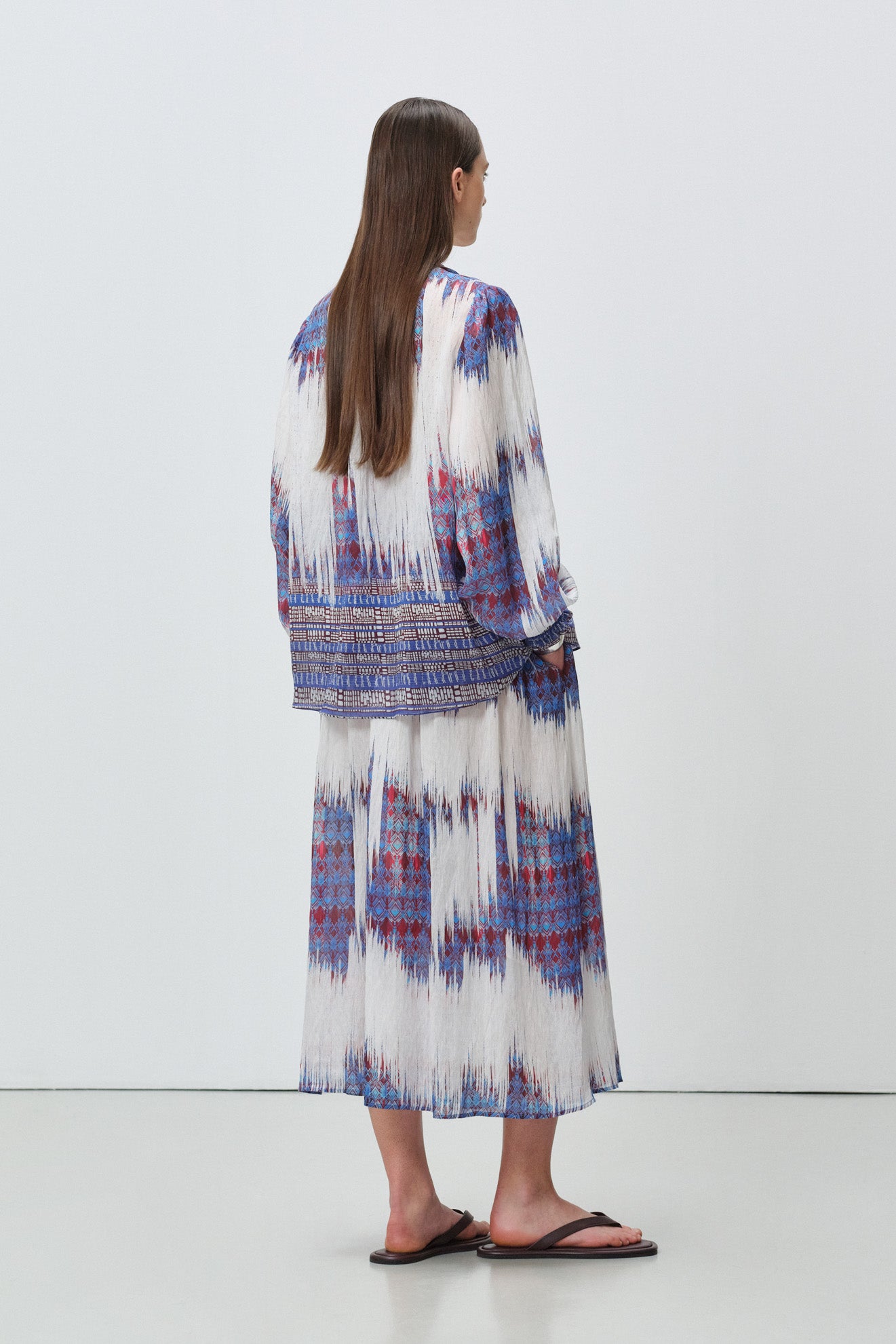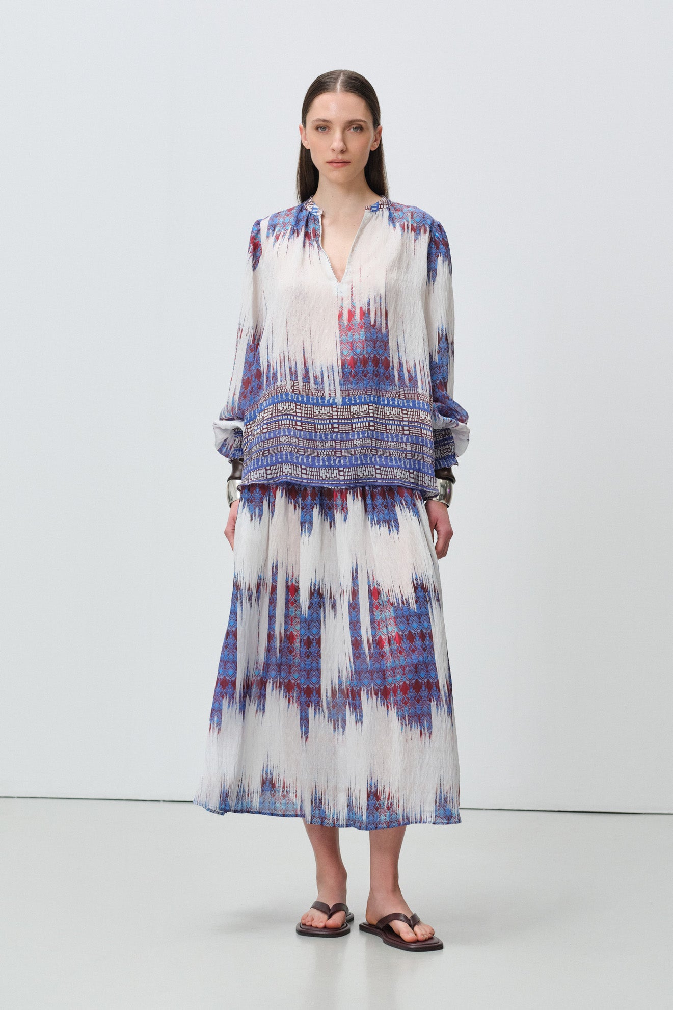 All-over abstract tie-dye and bohemian border print in white base with indigo, burgundy and earthy accents