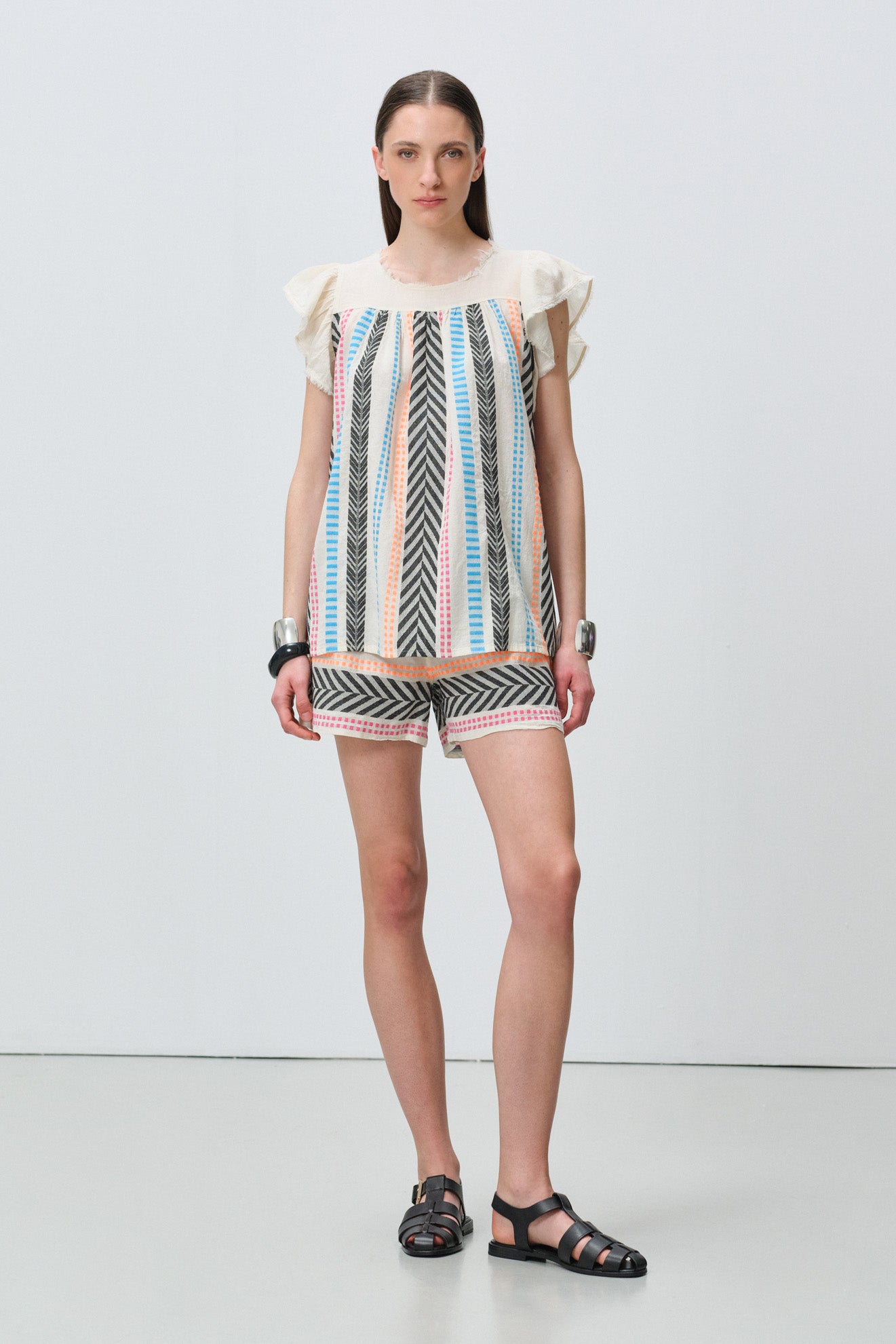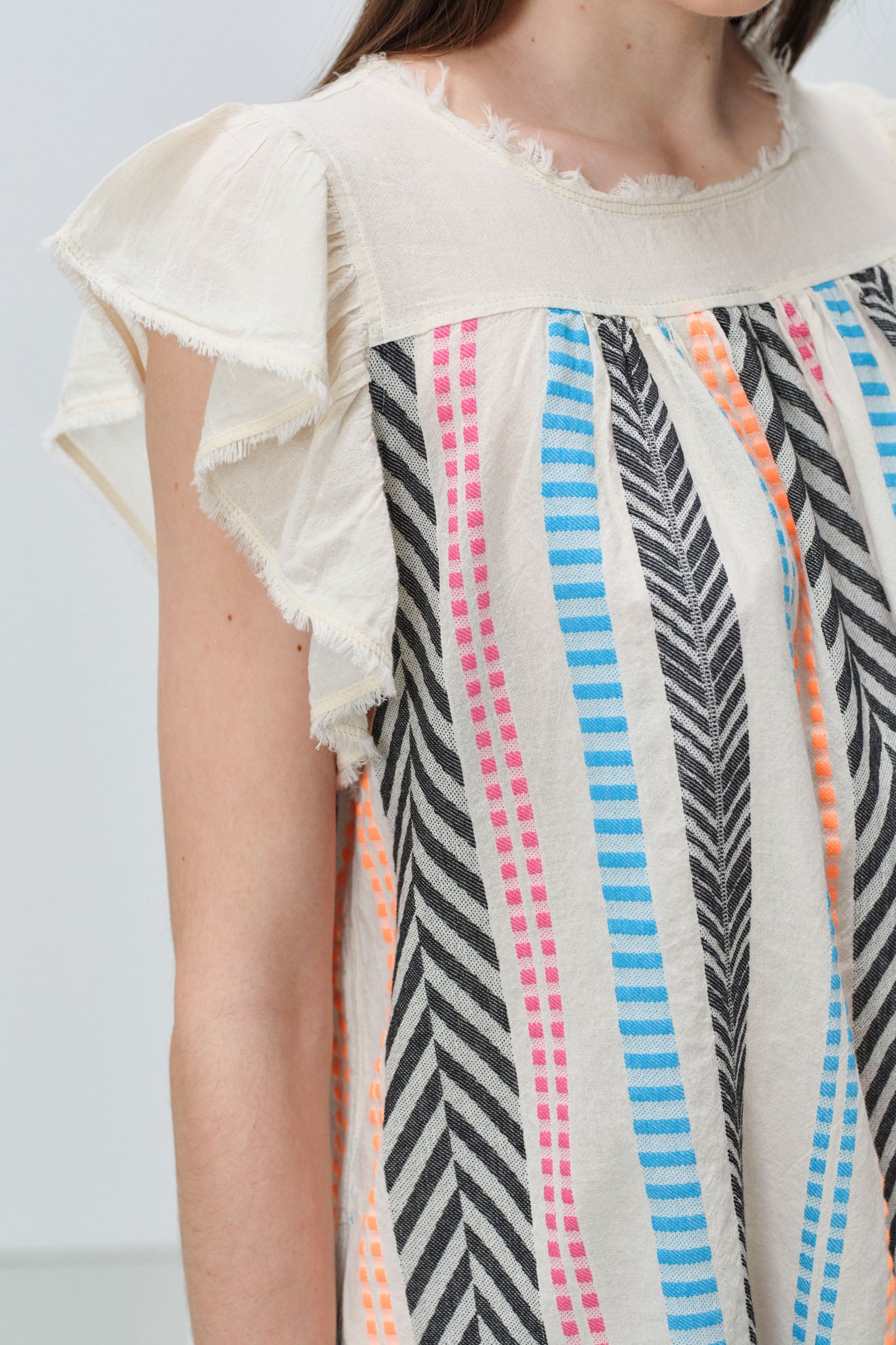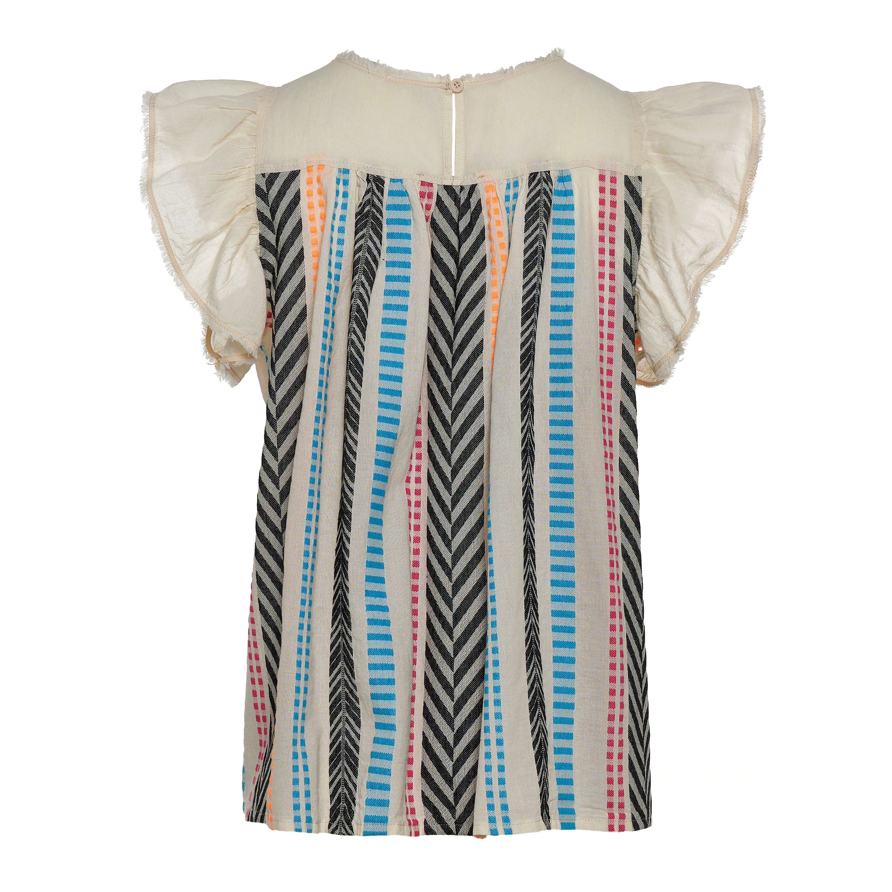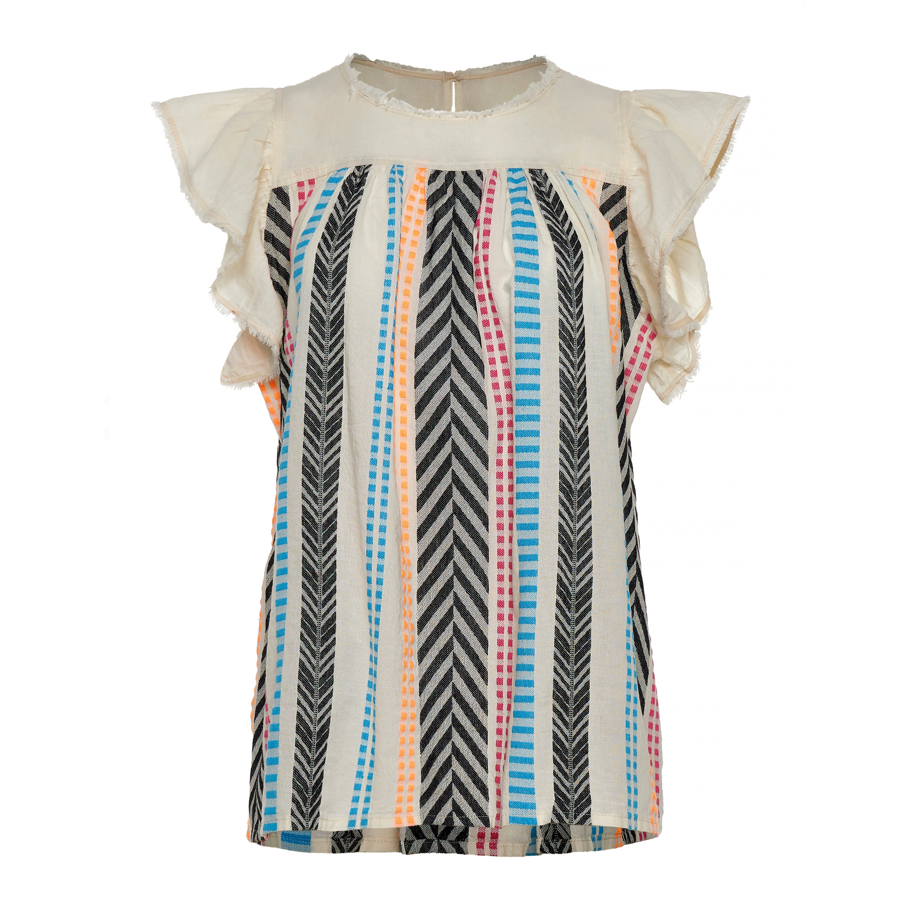 Round neckline with delicate ruffle-trimmed flutter sleeves