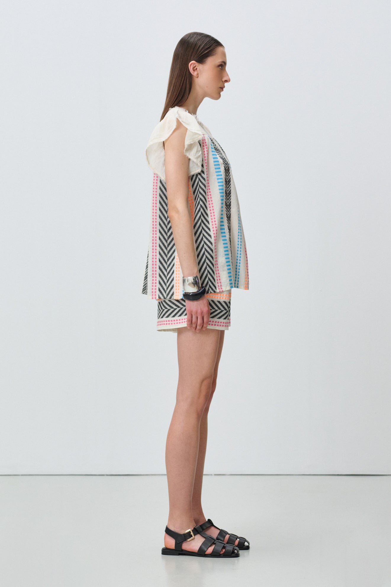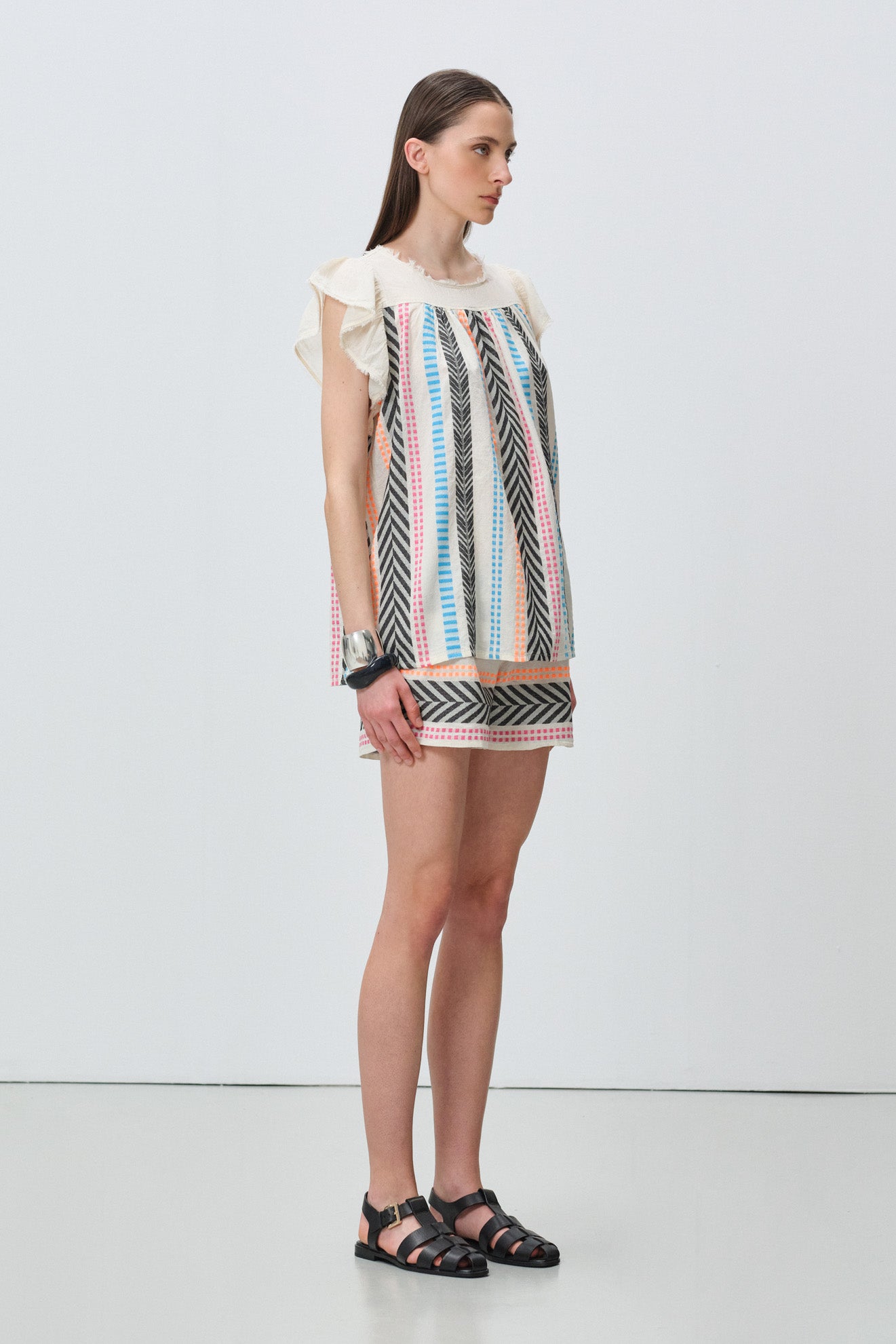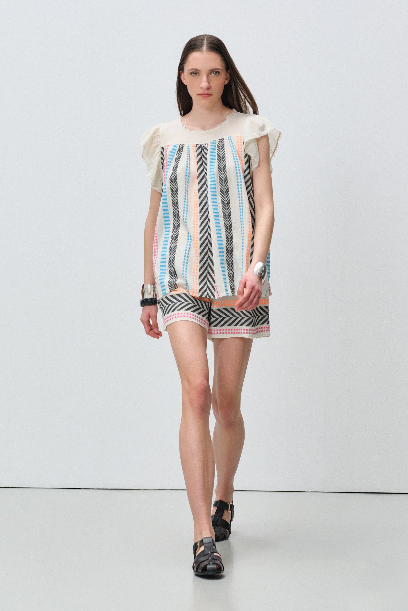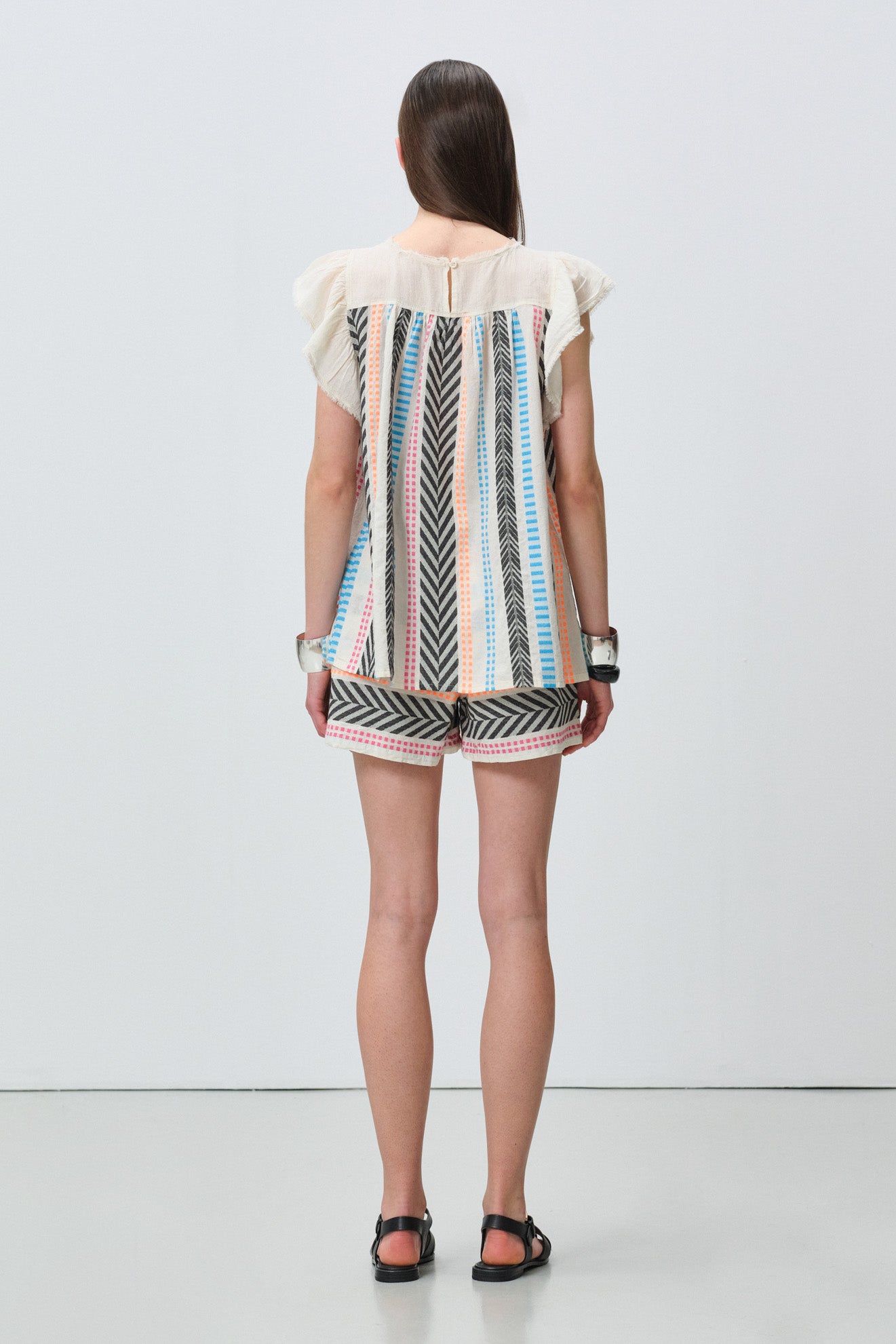 Round neckline with delicate ruffle-trimmed flutter sleeves