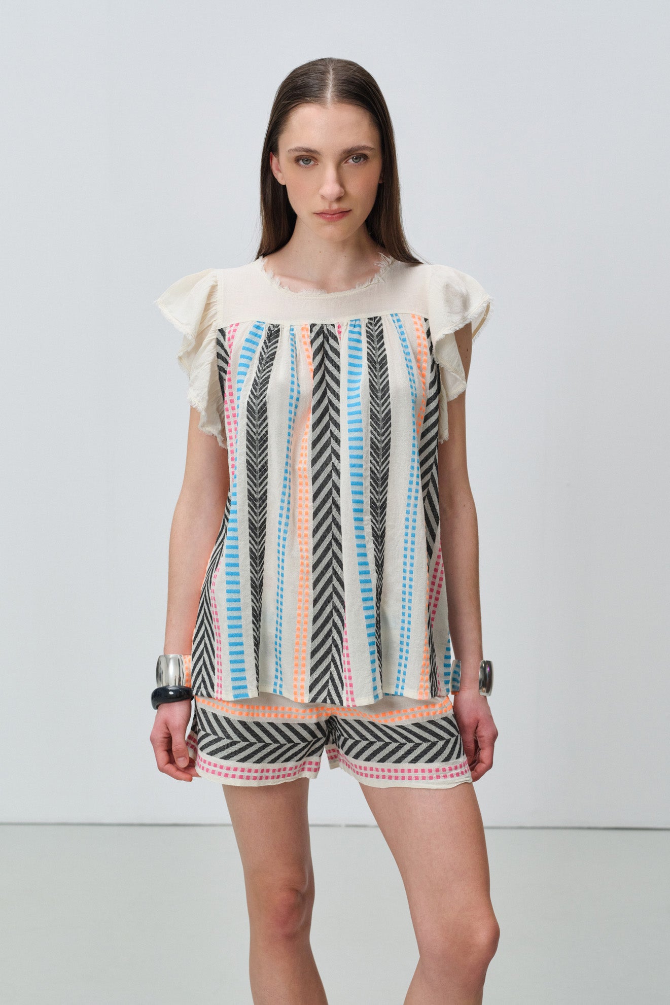 All-over vertical stripe and chevron jacquard pattern in soft multi-colored tones